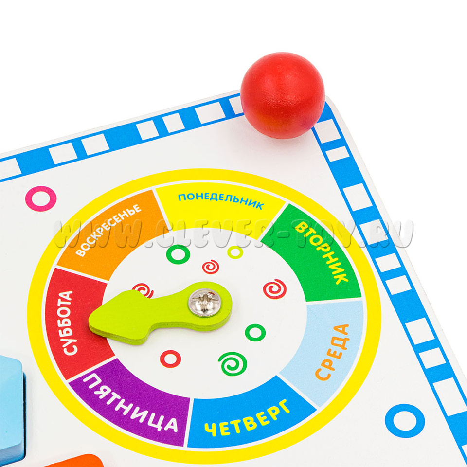 Разделён по дням недели, каждый день обозначен своим цветом: понедельник – жёлтый, вторник – зелёный, среда – голубой, четверг – синий, пятница – фиолетовый, суббота – красный, воскресенье – оранжевый. В центре круга – вращающаяся стрелка-указатель.