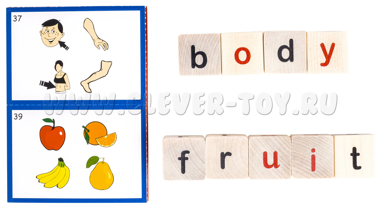 • 25 деревянных кубиков с буквами английского алфавита, сочетаниями букв, местоимениями, глаголами, отрицательными частицами, знаками препинания, вопросительными словами;