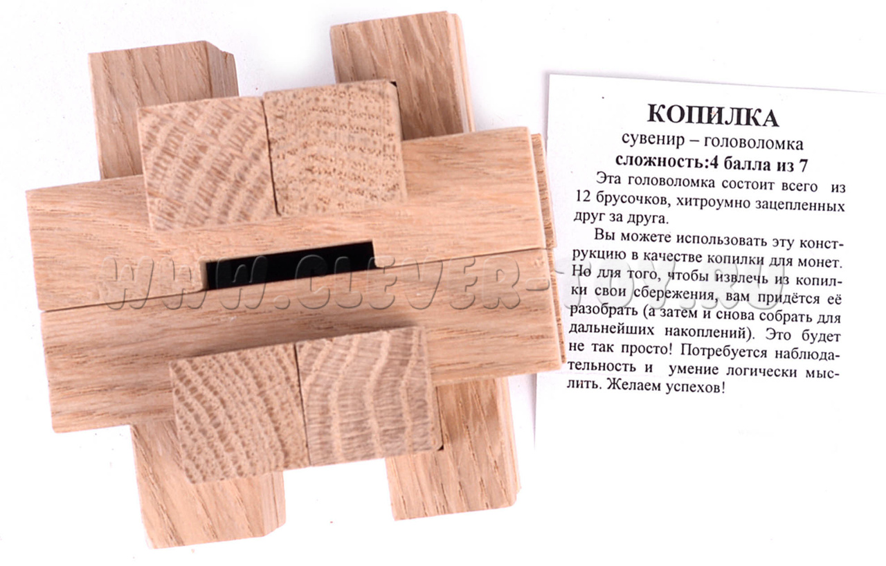 Собрав головоломку "Копилка", вы можете действительно складывать в нее монетки, только помните, что это все таки головоломка и достать монетки может быть не так просто.