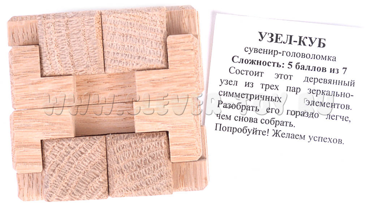 "Узел-куб" – это авторская головоломка, состоящая из деревянных элементов, которые нужно собрать в определенный узел-куб. Головоломка имеет несколько пар зеркально-симметричных деталей, которые необходимо использовать при сборке для сборки головоломки.