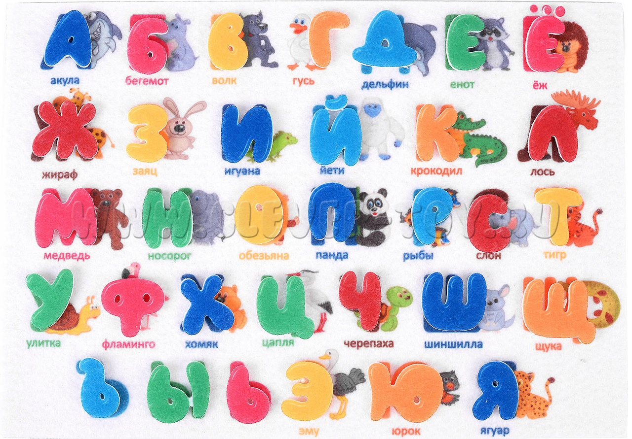 Название каждого животного начинается с буквы, рядом с которой оно находится: А-акула, Б-бегемот, В-волк, Г-гусь, Д-дельфин, Е-Енот, Ё-ёж и т.д.