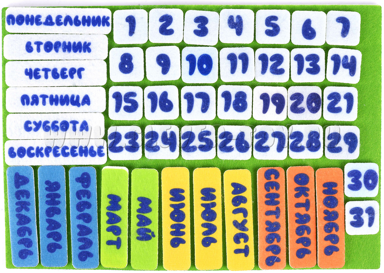 - игровые элементы: числа от 1 до 31, элементы с названиями дней недели, месяцев, времён года и т.д.