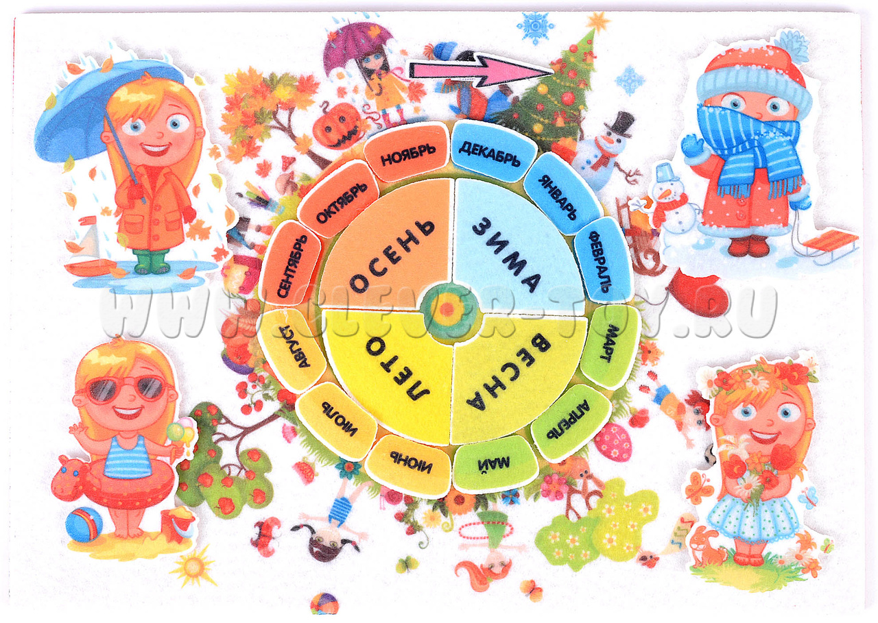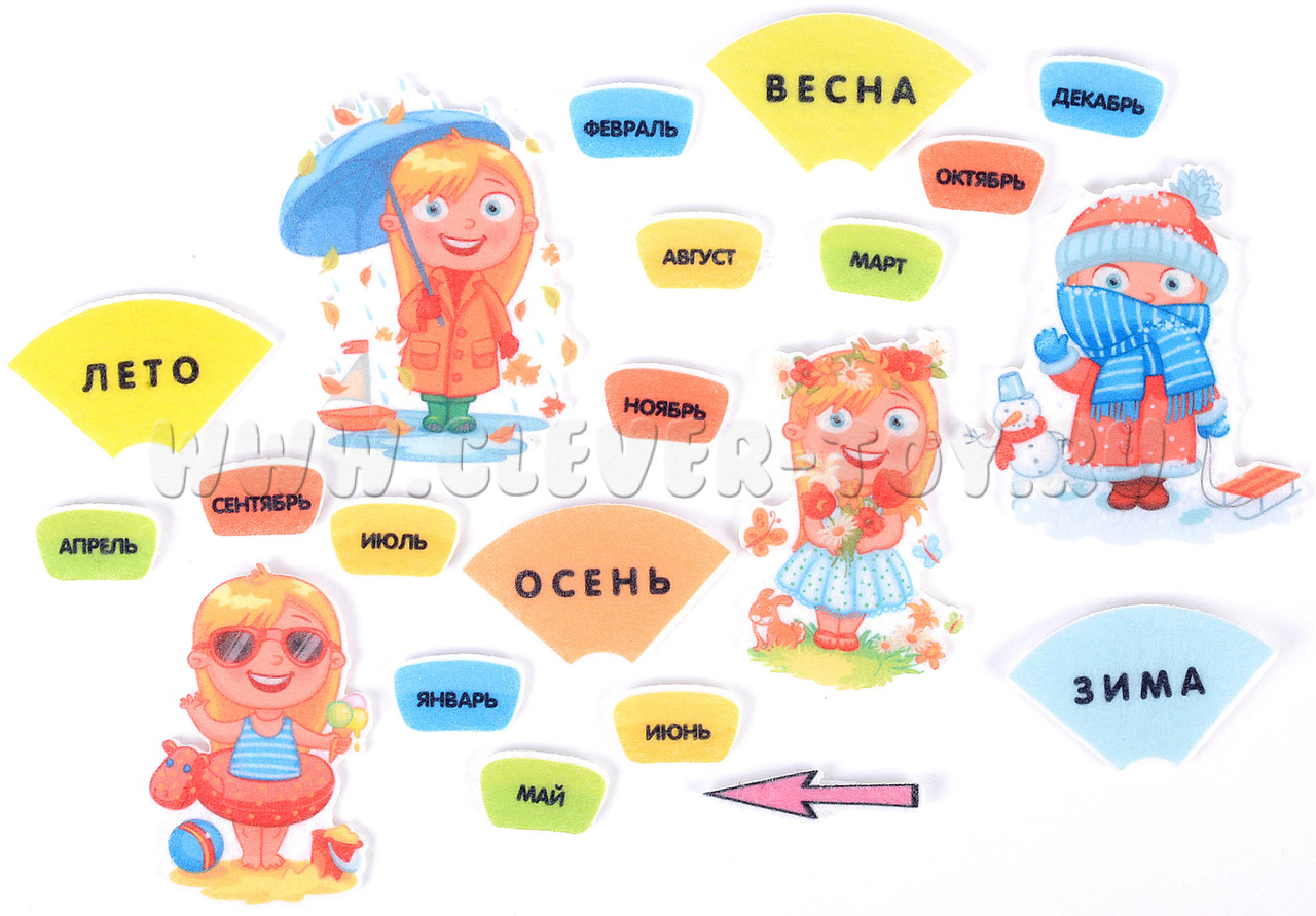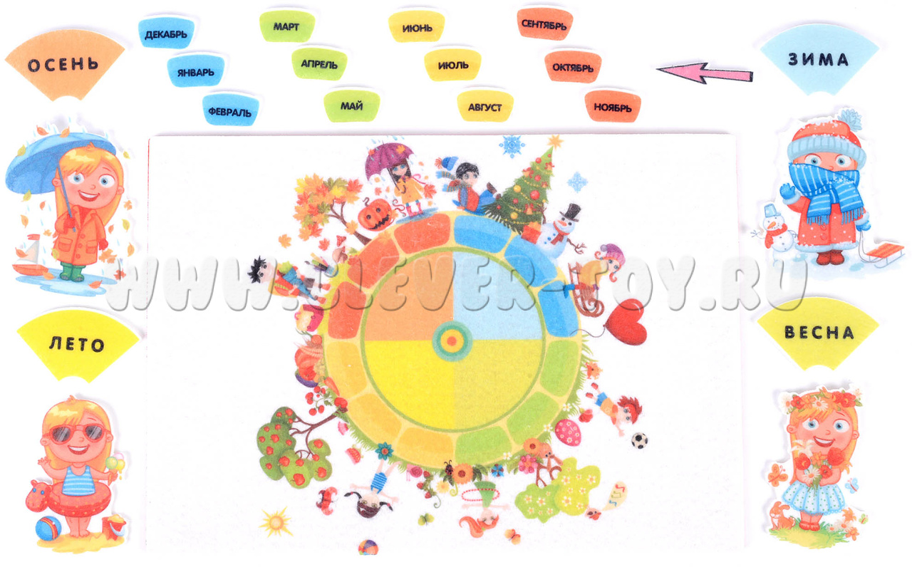 • фигурки с надписями – 12 шт. для каждого месяца и 4 шт. со временами года: лето, осень, зима, весна; надписи сделаны чёткими печатными буквами, каждое время года имеет свой узнаваемый цвет для удобства группировки;
