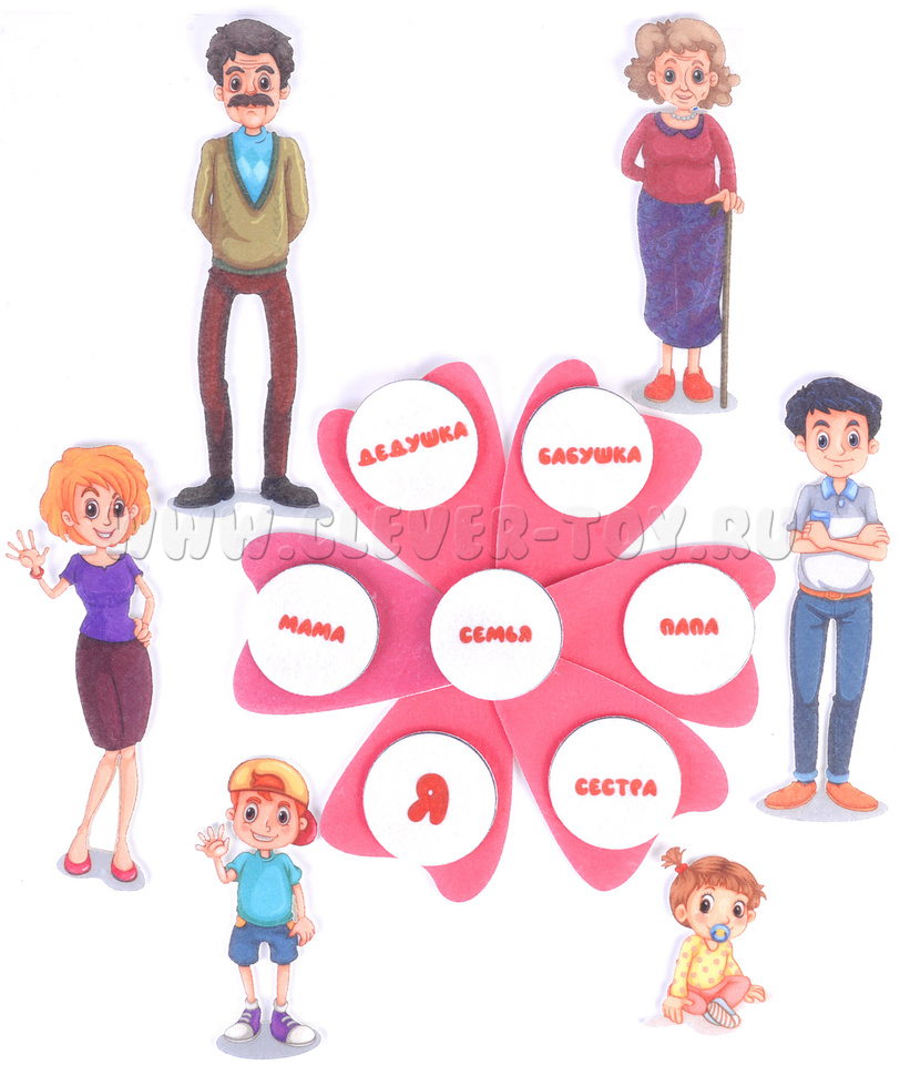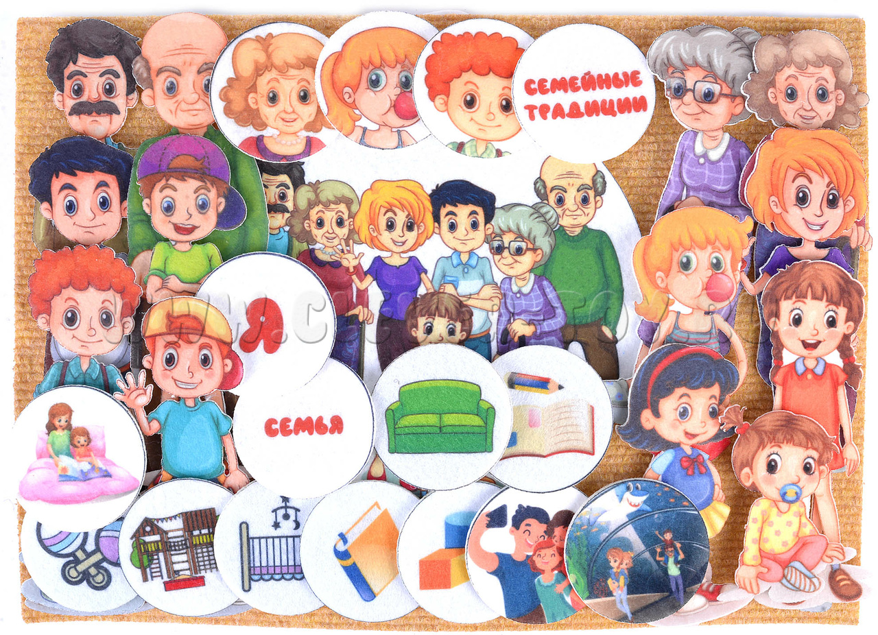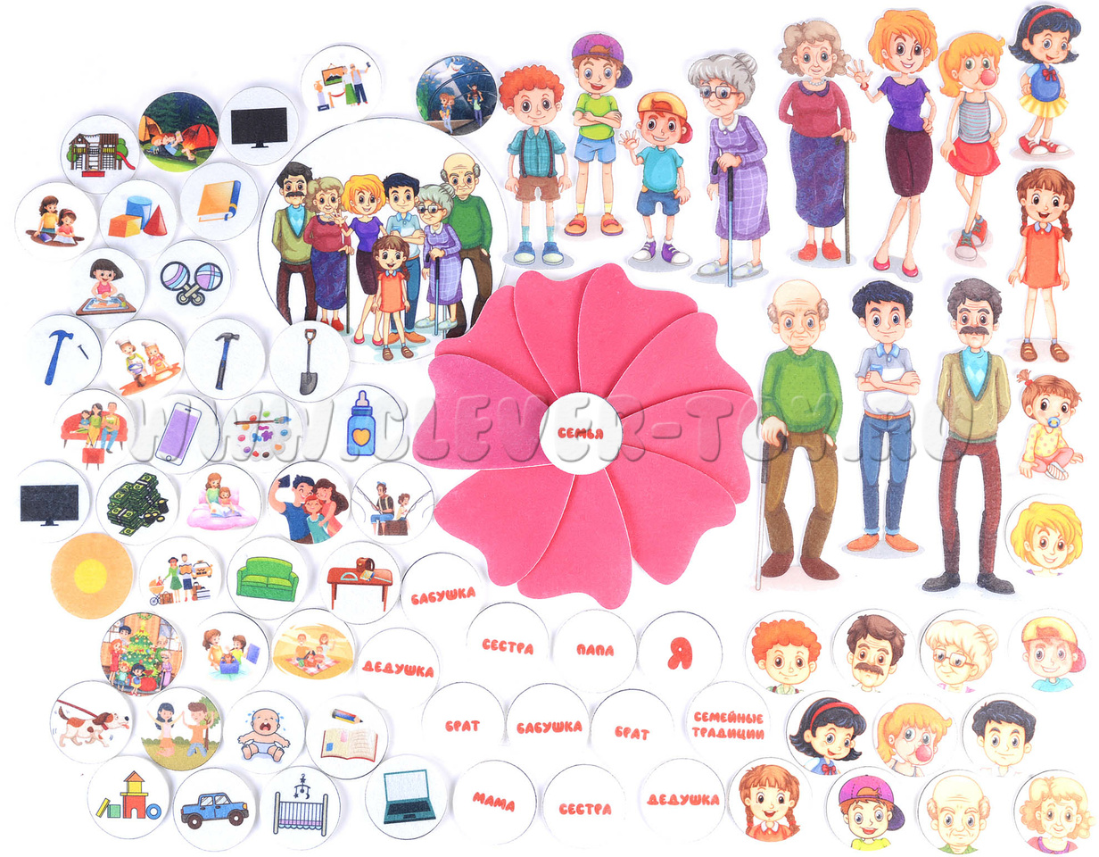 Игровое поле 25*35см, фигурки семьи, названий, портреты, фигурки занятий с детьми, лепестки.