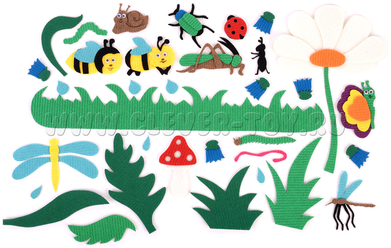 • насекомые: бабочка, гусеница 2 шт., улитка, оса, пчела, божья коровка, кузнечик, стрекоза, комар, жук, муха, муравей, червяк;