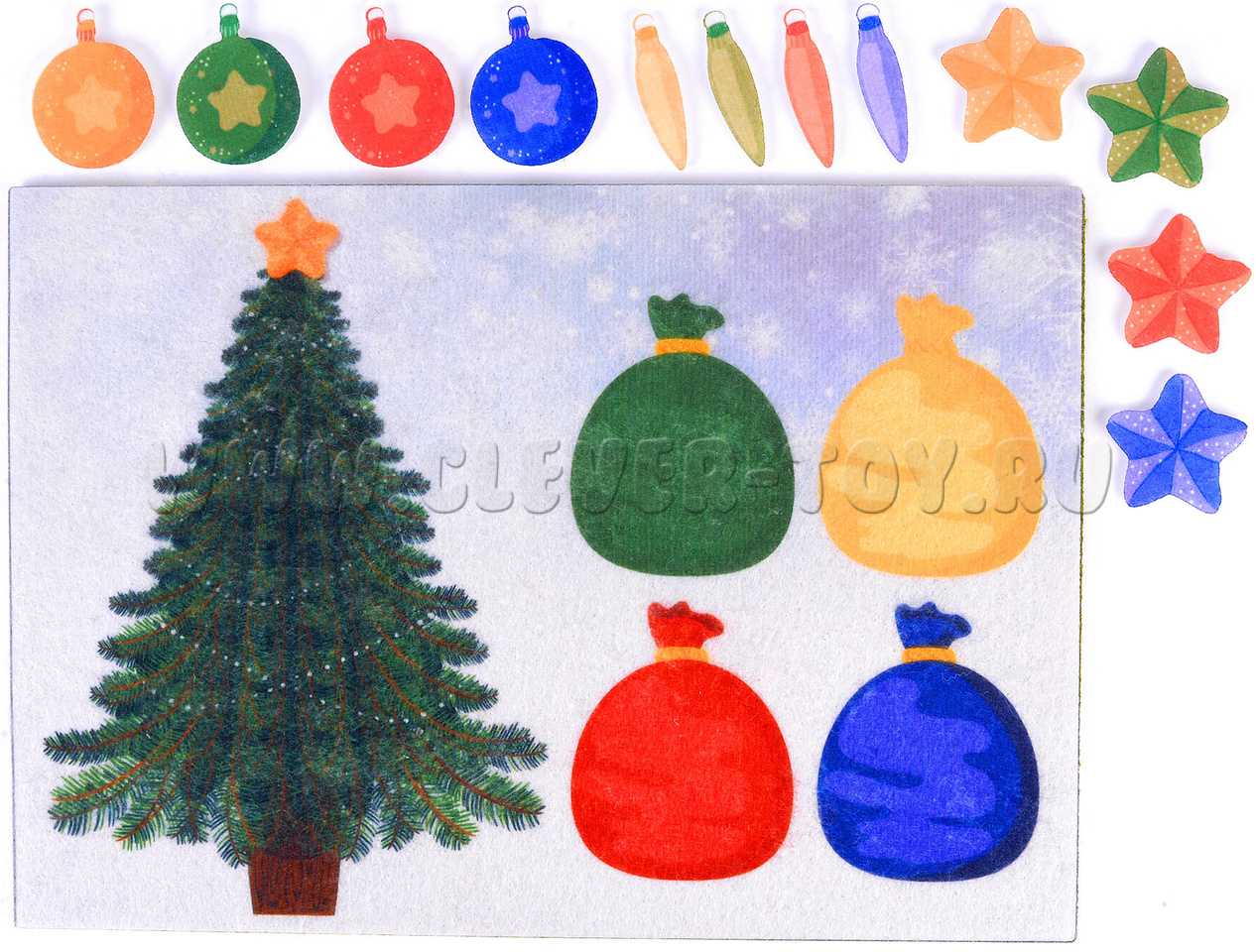 У каждой фигурки сзади есть липучка, при помощи которой можно размещать их на игровом поле. Ребенок может поместить игрушку на елку или распределить в мешочек по цвету.