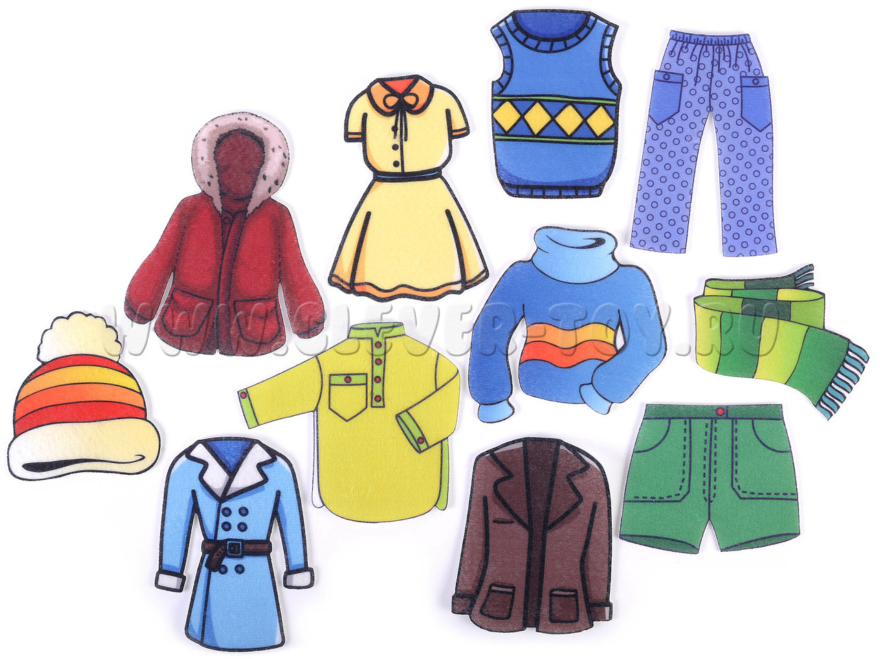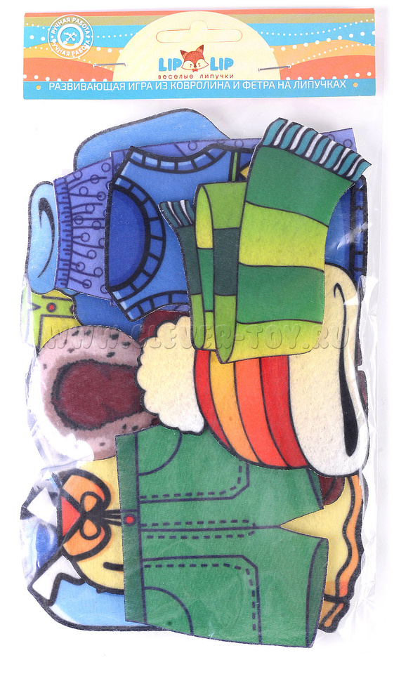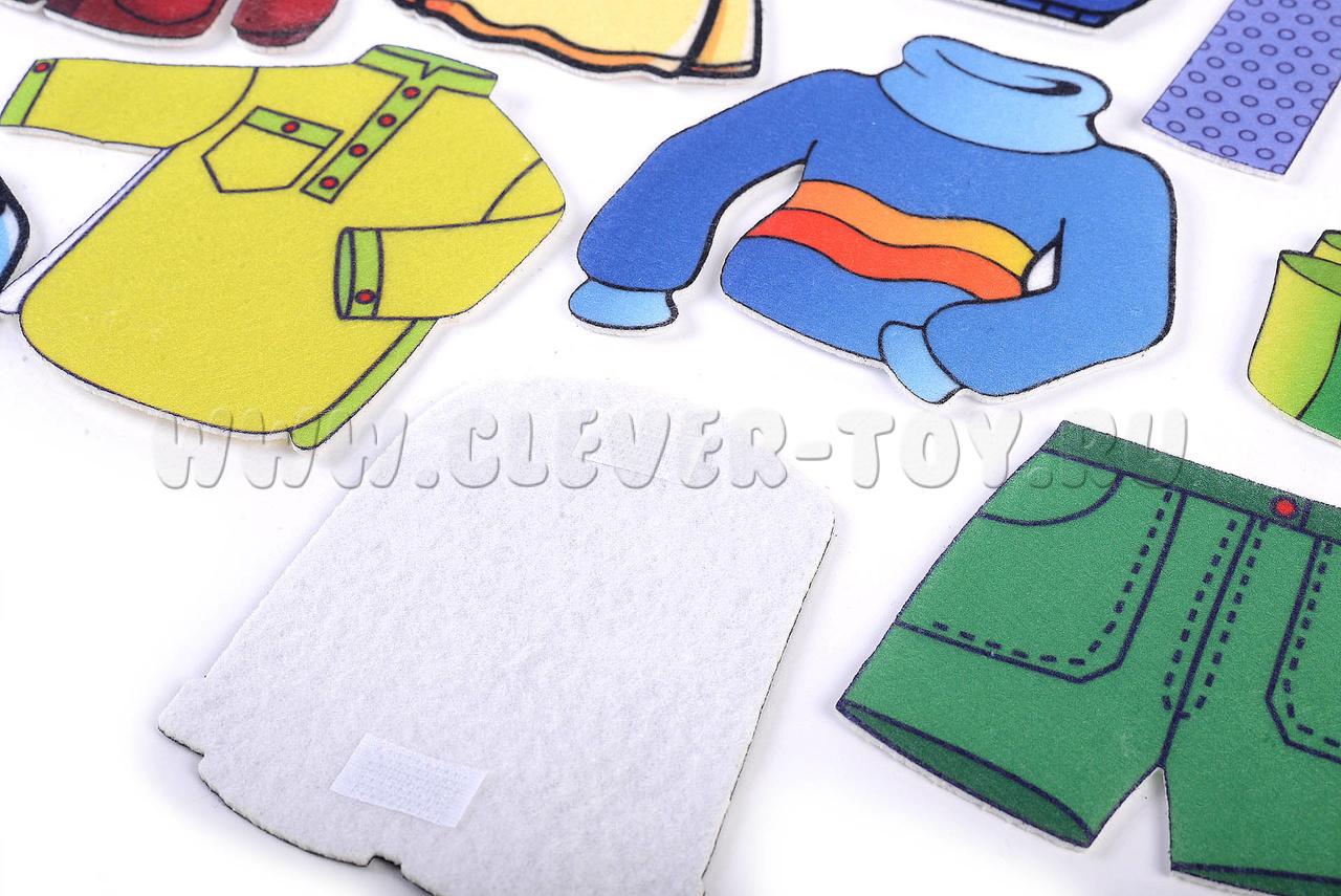 В комплекте 11 фигурок с изображениями одежды, на липучках.