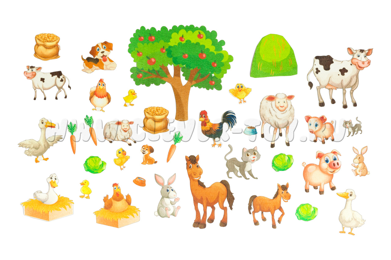 • игровые элементы и фигурки животных – коровы, поросята, курицы, петух, собаки, кошки, зайчики, лошади, овцы, гуси, цыплята, сено, мешки с зерном, морковка, капуста, яблоня.