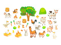 - игровые элементы и фигурки животных – коровы, поросята, курицы, петух, собаки, кошки, зайчики, лошади, овцы, гуси, цыплята, сено, мешки с зерном, морковка, капуста, яблоня.