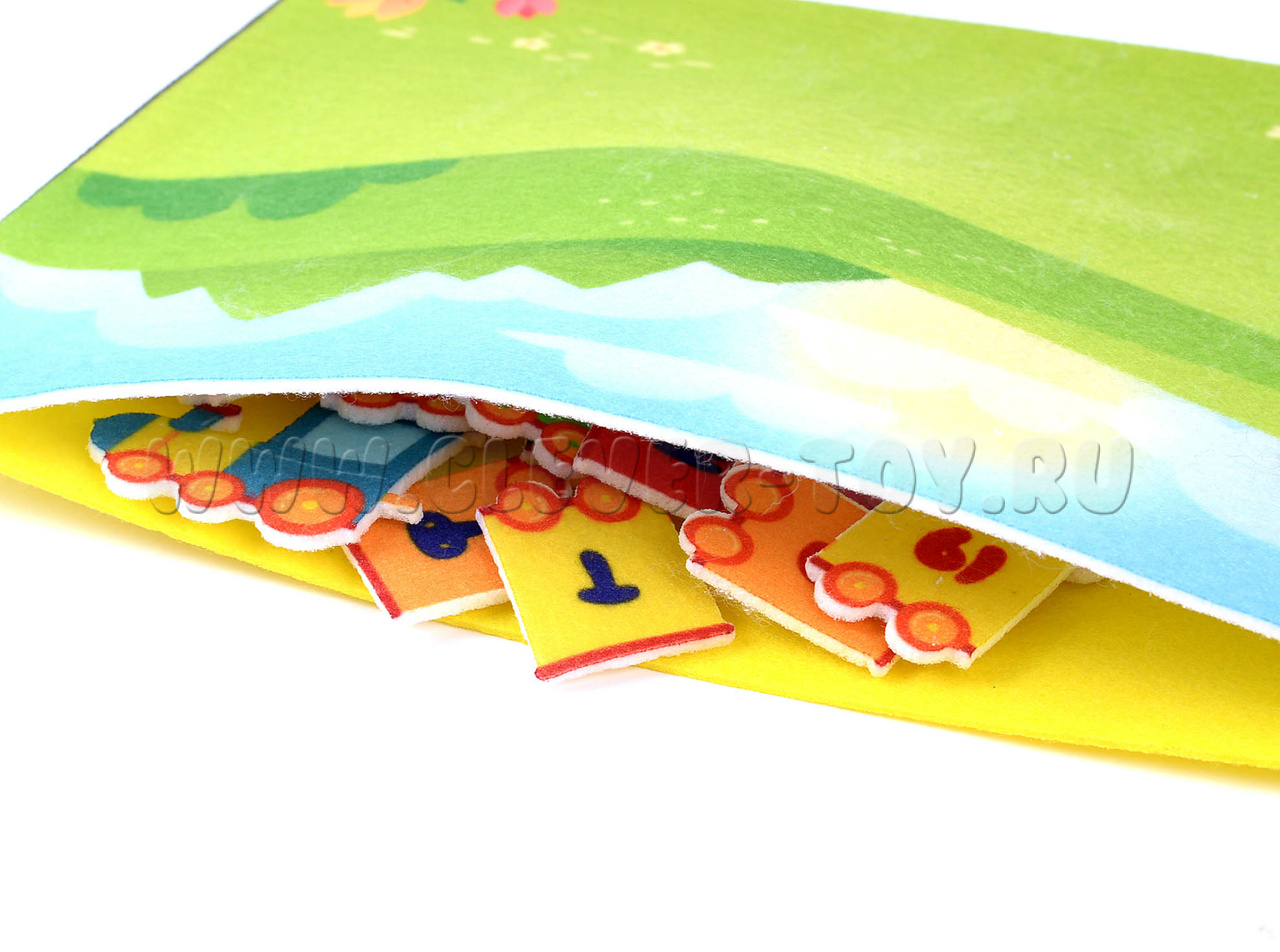 Сзади у каждой фигурки есть липучка, с помощью которой можно прикрепить вагончик на поле. Материал игры - безопасный фетр.