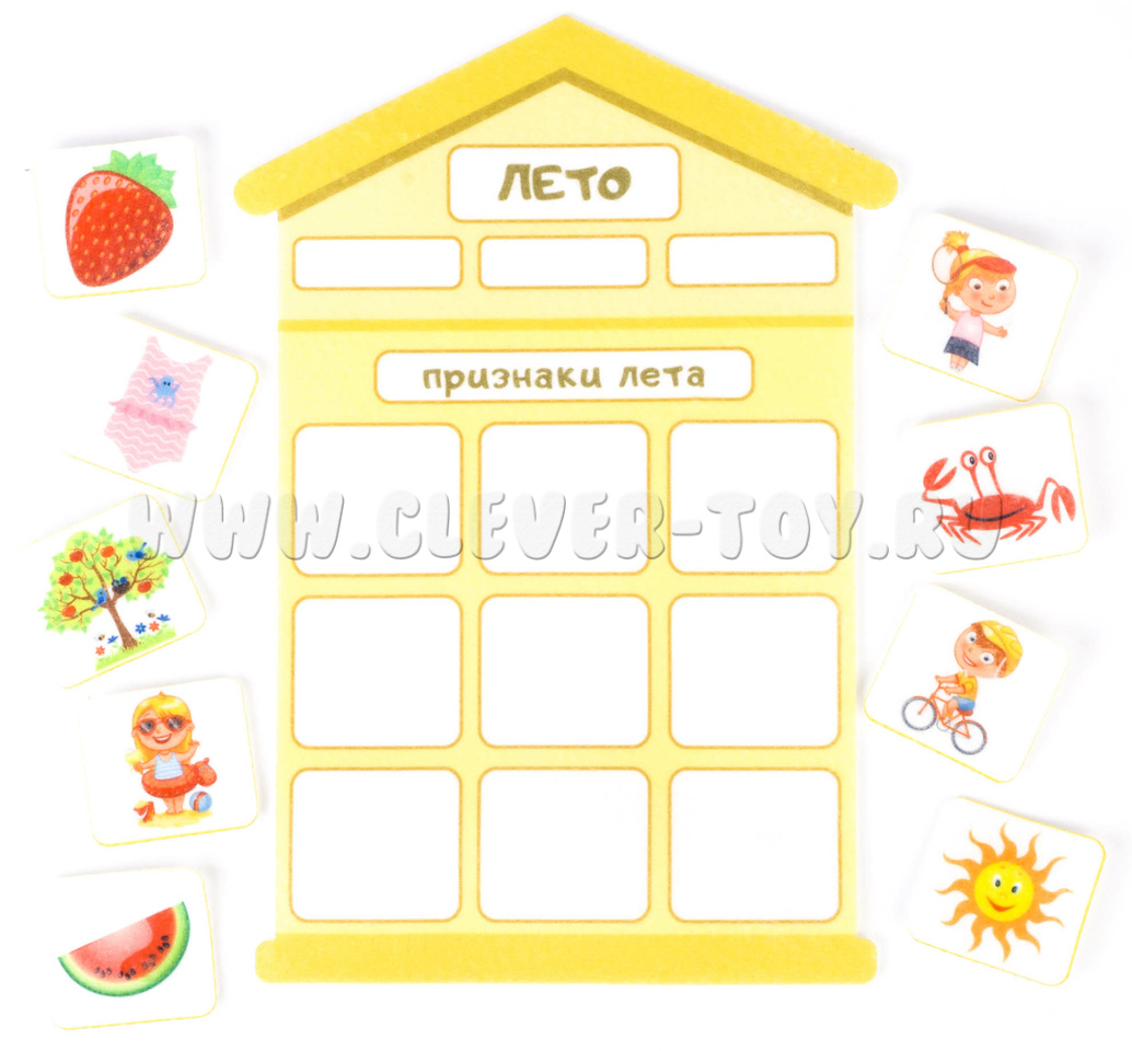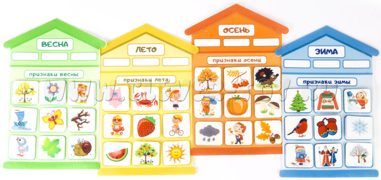 Игровой набор "Признаки времен года" -это аппликация, с помощью которой детям будет легкозакрепить знания о том, что такое зима, весна, лето и осень, запомнить их последовательность и главные признаки.