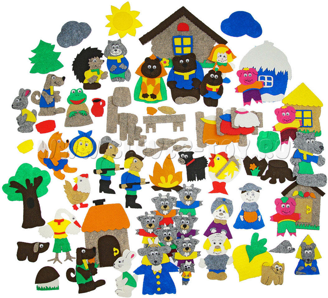 • персонажи – дед, бабка, внучка, жучка, кошка, мышка маленькая, колобок, кот, курочка Ряба, журавль, мышка-норушка, лягушка, ёжик, петушок, зайка белый, зайка серый, волк, лиса, медведь, соломенный бычок, 2 собаки, 2 охотника, матушка, медведица, медвежонок, коза, 7 козлят, 3 поросёнка;