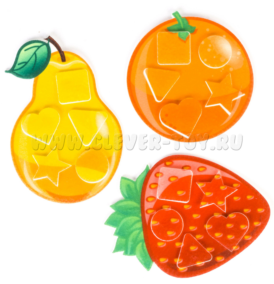 • 3 крупных элемента с изображением фруктов, апельсин, груша и клубника,