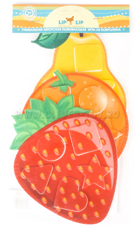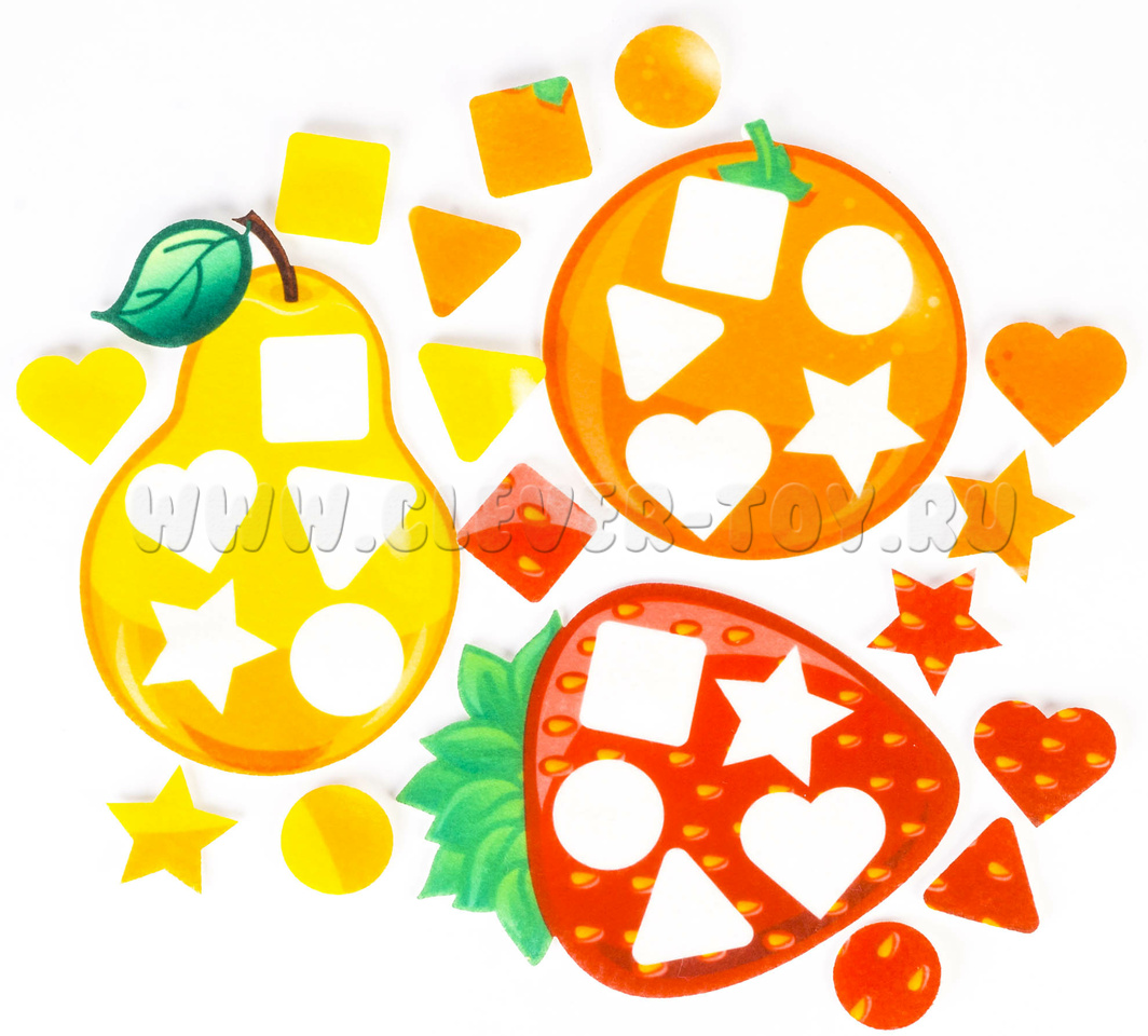 • маленькие фигурки на липучках, звезда, треугольник, квадрат, круг и сердце (по 5 фигур на каждый фрукт).
