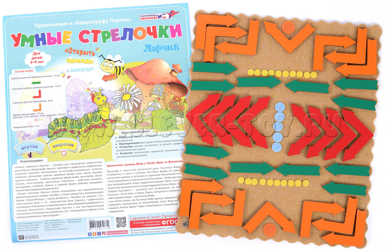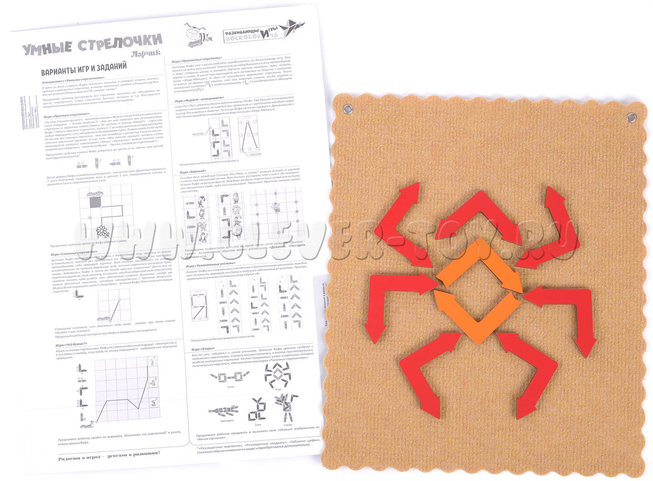 Во время игр и занятий с игровым пособием дети познакомятся с умными стрелочками, научатся составлять и решать графические диктанты, составлять узоры и освоить «Рисование стрелочками».