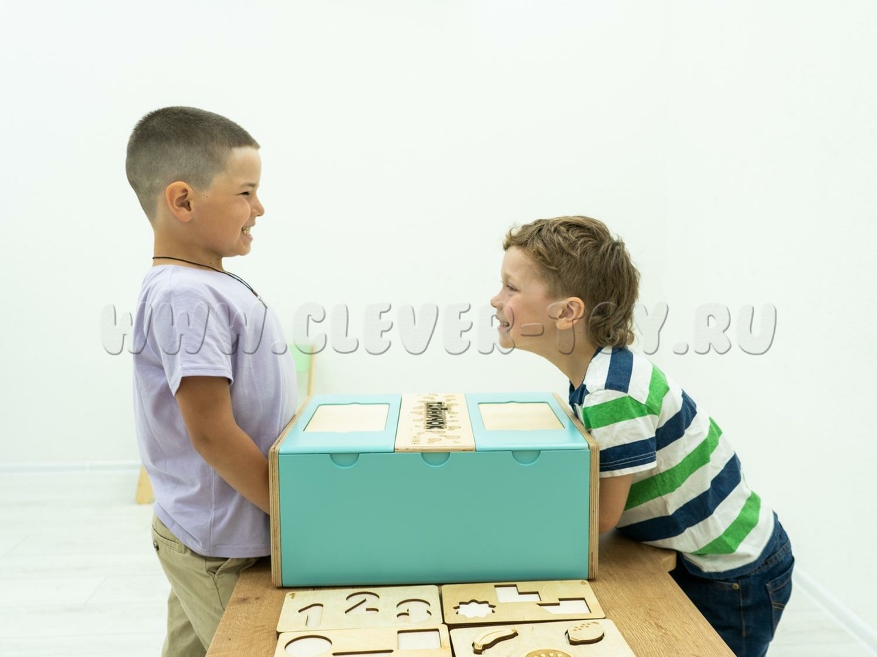 Чтобы тактильные элементы не терялись, хранить их можно внутри самого Тайничка, в специально отведенной зоне в центре ящика. Коробочка плотно закрывается, не давая выпасть содержимому.