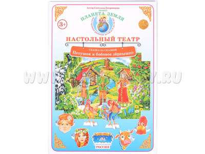 Настольный театр "Петушок и бобовое зернышко" это постановка сказки спомощью объемных фигур связанная с книжным текстом.