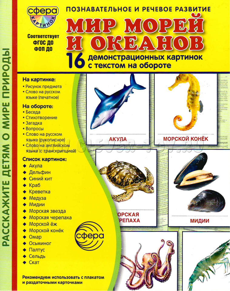 Состав комплекта (16 карточек): Рыбы: акула, дельфин, морской конек, синий кит, палтус, сельдь, скат. Моллюски: мидии, осьминог. Ракообразные: краб, креветка, омар. Беспозвоночные: медуза, морская звезда, морской ёж. Рептилии: морская черепаха.