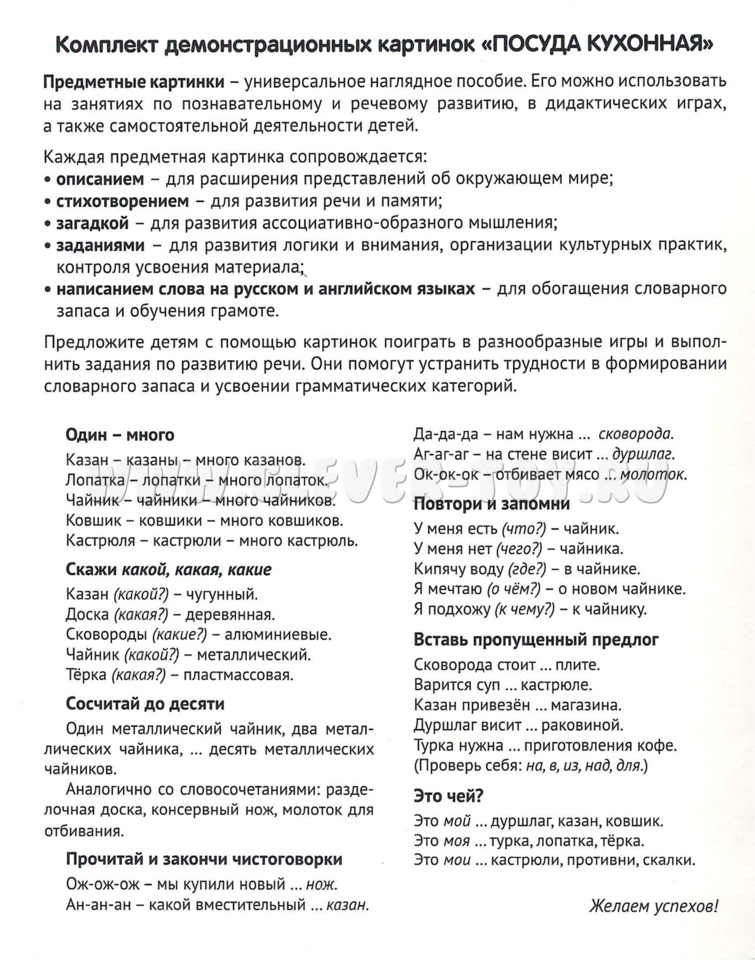На обороте каждой предметной картинки - описание, вопросы для ребёнка, название на русском и английском языках.