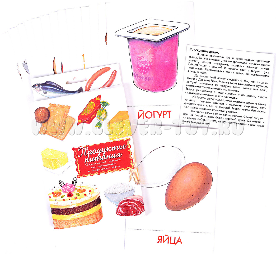 В набор входит: Дидактические карточки "Овощи" Дидактические карточки "Фрукты" Дидактические карточки "Продукты питания"