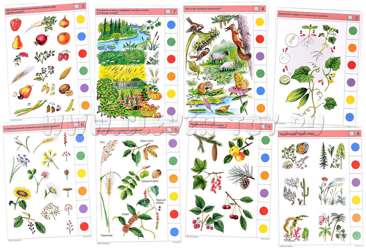 В процессе решения заданий ребёнок будет не только узнавать и называть новые и уже хорошо ему известные виды растений, но и называть их отдельные части, подбирать пары лист-плод и вершки-корешки, верно выстраивать этапы развития растений, искать различия и общие признаки у разных видов. Задания по теме равномерно распределены на два комплекта карточек Растения (1) и Растения (2), и не повторяются. Примеры заданий в карточках: 2б. Как растёт огурец: от семечка до семечка. 3б. Как можно назвать растения в каждом ряду одним словом? 4б. Чем и как питаются животные? 5а. Из каких растений изготовлены эти продукты питания? 7б. Что растёт в лесу, в водоёме, на лугу, в поле, в огороде, в саду?