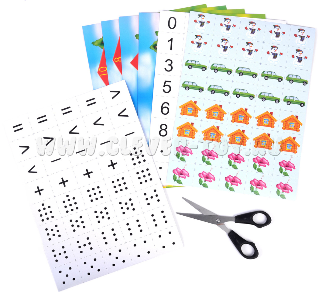 2. Если ребенок уже знаком с математическими знаками и понимает их смысл, предложите ему составить примеры на сравнение, сложение или вычитание. Для составления примеров подойдут карточки всех типов (карточки можно комбинировать);