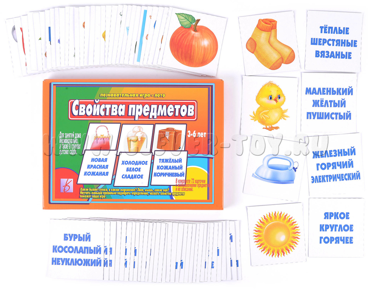Количество: 6 разрезных карт с картинками (по 6 на каждой, всего 36 карточек) и 6 разрезных карт со словами (каждая картинка описывается 3 словами, на большой карте по 6 троек свойств, всего 36 карточек)