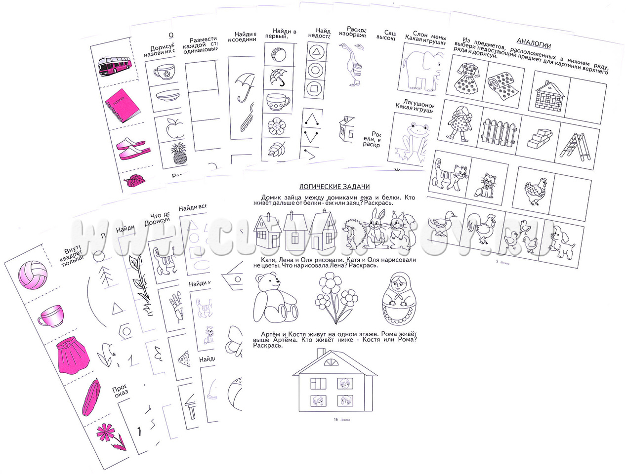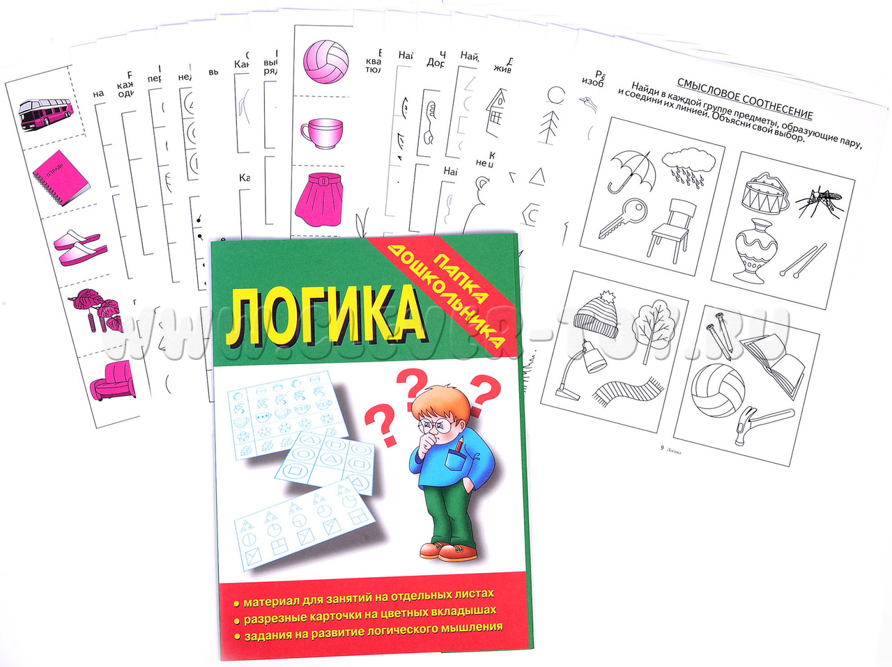 Внутри вы найдете множество заданий на отдельных листах, разрезные карточки (цветные), задание на развитие логики.