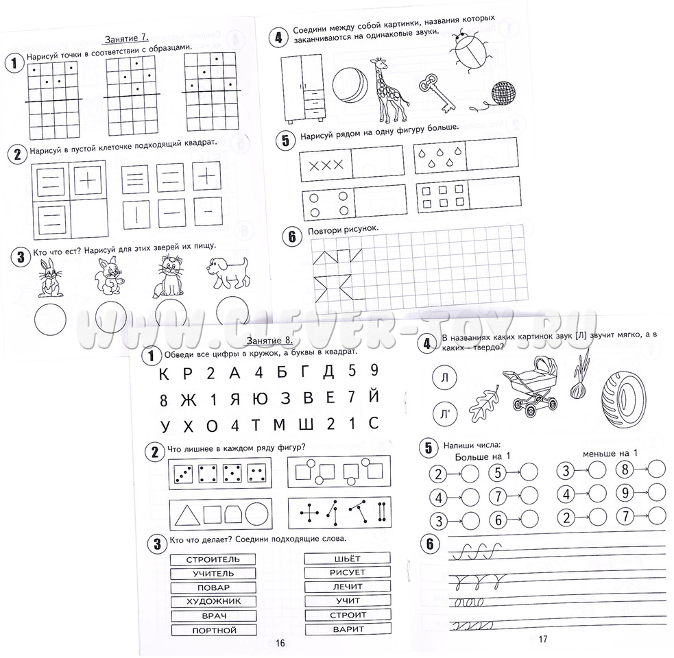Всего 2 тетради по 15 занятий в каждой. Каждое занятие предполагает всесторонне развитие ребенка, так как в него включено 6 заданий разной тематики. Таким образом, в наборе получается 30 занятий и 180 заданий для дошкольников.