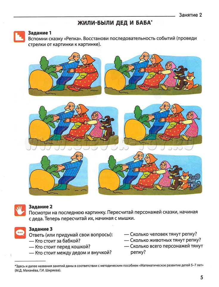 Задания в ней направлены на овладение ребенком навыками счёта, умением применять его для определения количества, на ознакомление с геометрическими предметами, развитие способностей ориентироваться во времени и пространстве.