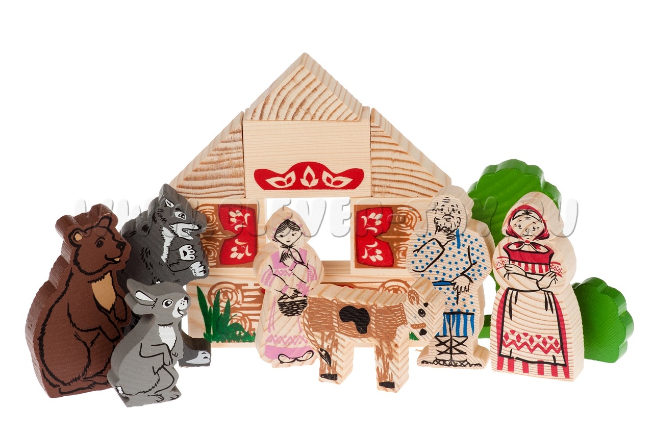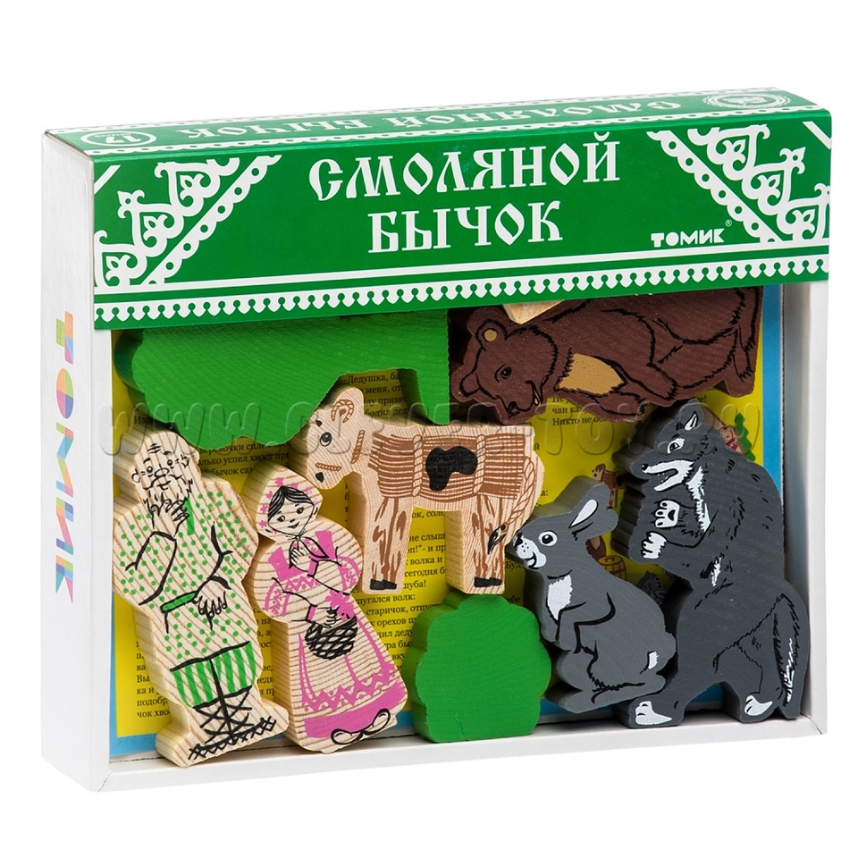 В набор входят деревянные модели персонажей и декорации сказки "Смоляной бычок" (всего 13 деталей), а также вкладыш с текстом сказки.