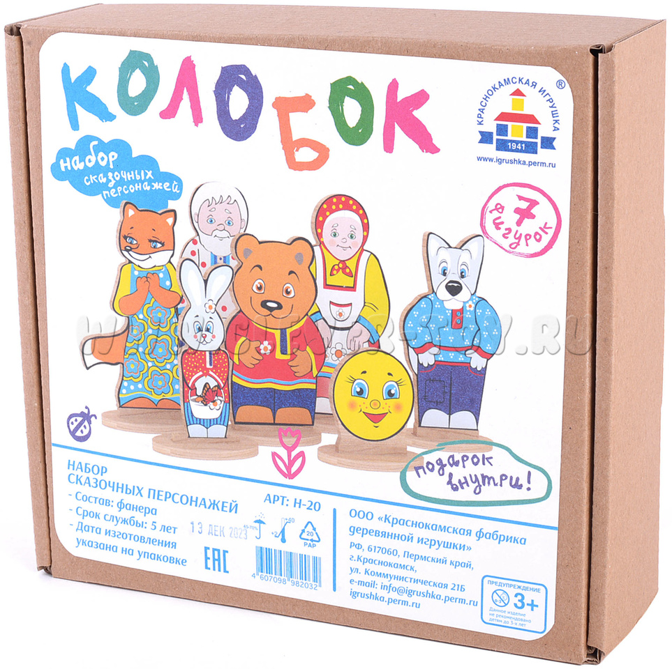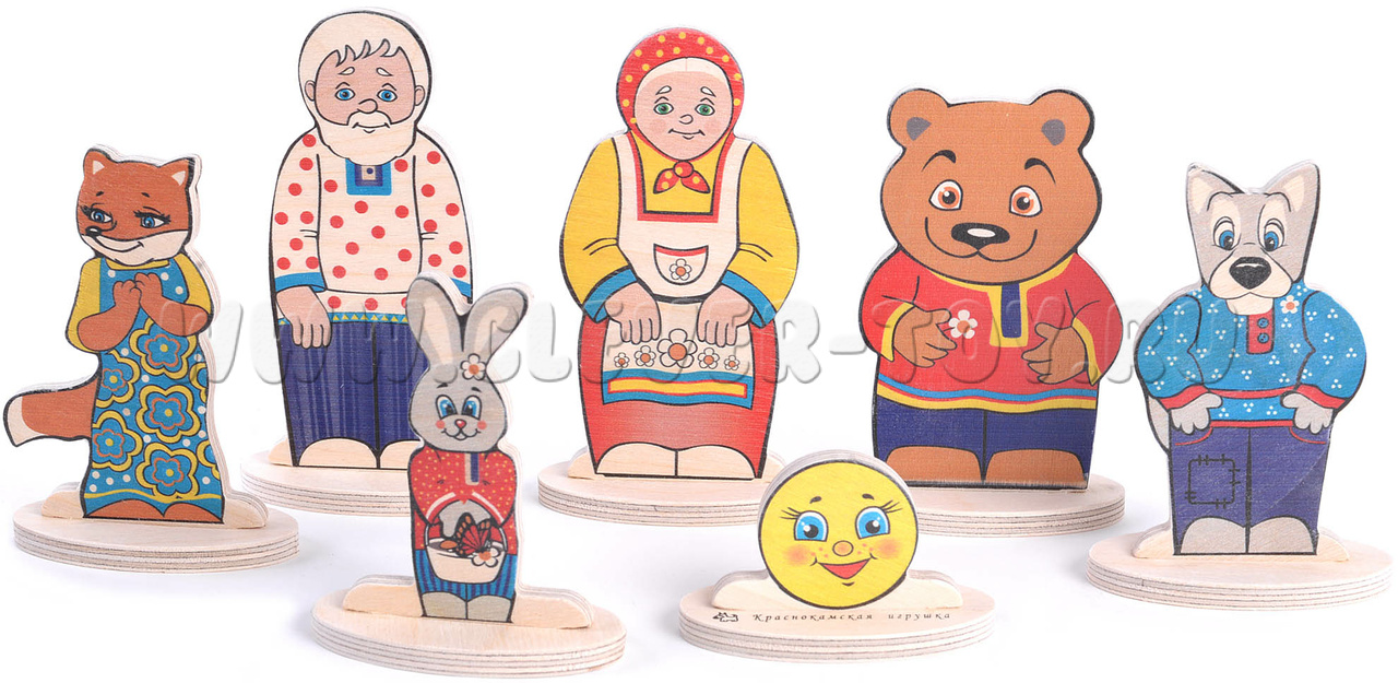 - 7 деревянных фигурок на подставках (Колобок, Дед, Бабка, заяц, медведь, волк, лиса) размером от 4 до 12 см.
