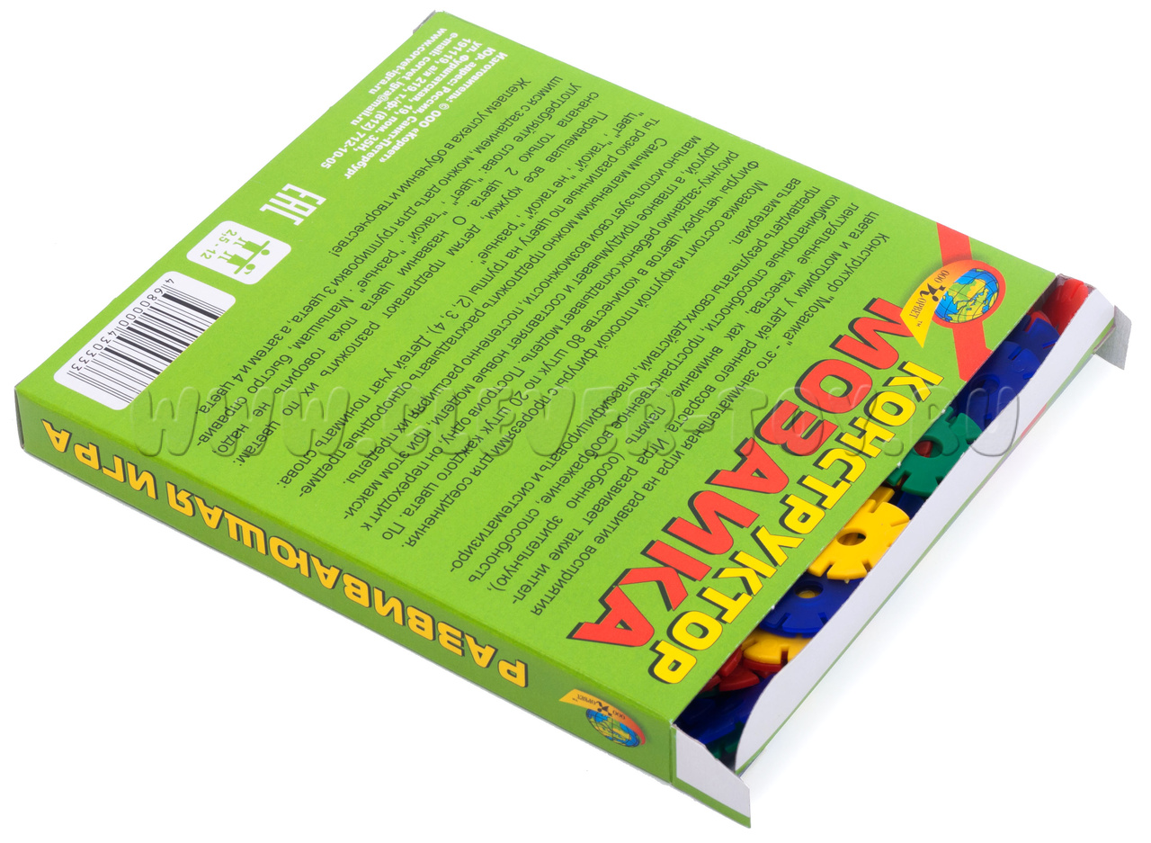 Состоит из круглых плоских фигур с прорезями для соединения. Фигуры четырех цветов в количестве 80 шт. По 20 каждого цвета.