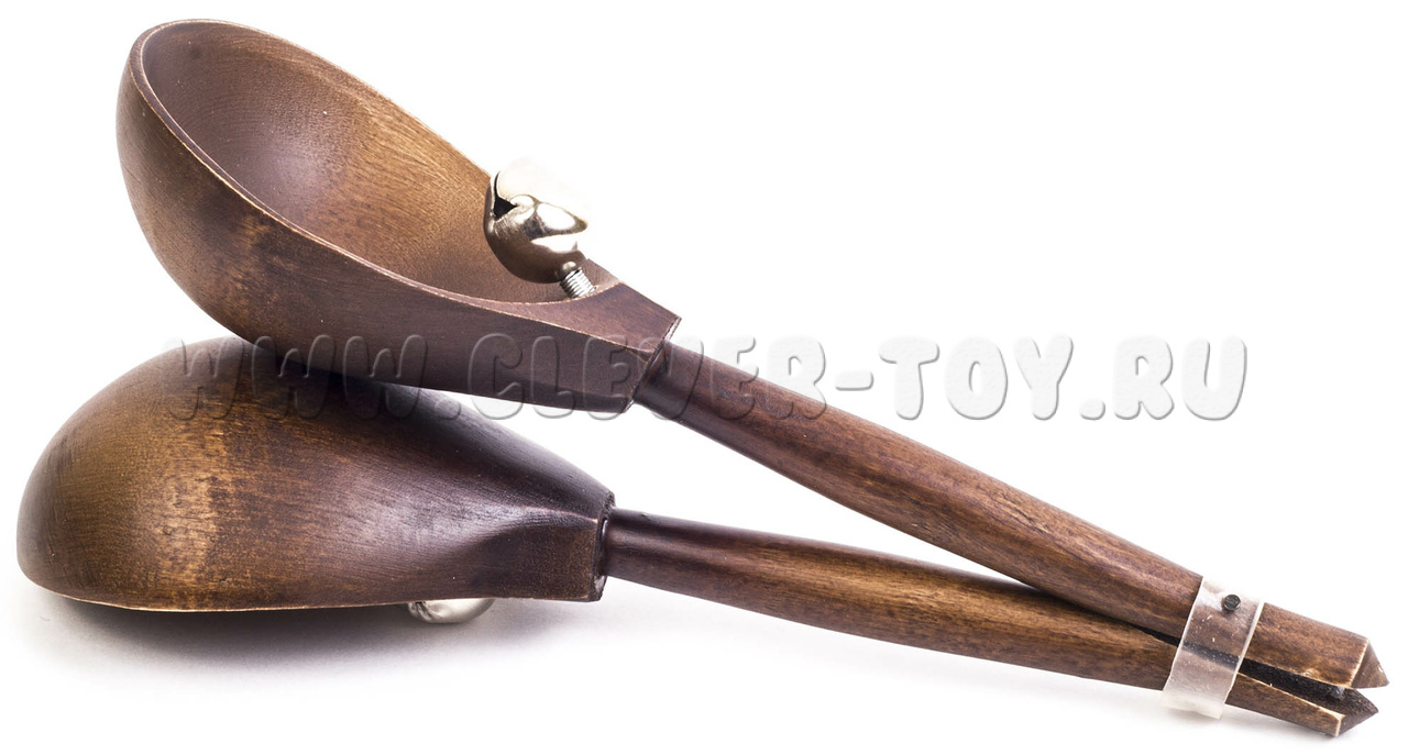 Ложки в станке народный музыкальный инструмент, который являлся предметом быта. Музыкальные ложки имеют некоторые отличия от обычных деревянных ложек. У них удлиненная рукоять и сделаны из более твердого дерева. Ложки в станке это две соединенные между собой, ложки. Их черенки скреплены между собой штырем и сточены под углом в 45 градусов. Благодаря их конструкции, ребята с легкостью извлекут звуки, ударяя по ладошкам и коленям. Ложки – развивающий музыкальный инструмент, который отлично подойдет начинающим музыкантам и познакомит с историей и культурой древней Руси. Деревянные ложки гармонично будут смотреться как в детский образовательных учреждениях, так и в домашних условиях. Ложки в станке выполнены в мастерской Сереброва, заботливыми и теплыми руками, только из натуральных, экологичных материалов. Ложки выполнены из натуральной березовой, тонированной древесины, а с наружной стороны ложки прикреплен бубенчик. Мы стараемся делать так, что бы развитие проходило не только увлекательно, но и безопасно! Деревянные ложки купить можно в нашем магазине с доставкой в любой город России.