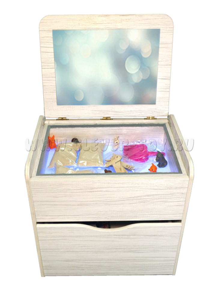Это профессиональный набор инструментов, предназначенный для увлекательных развивающих занятий с детьми. В состав сундучка включены лучшие методические материалы, книги, настольные игры, световая песочница, наборы для песочной терапии и тематическое программное обеспечение для установки на компьютер, интерактивный стол или интерактивную панель.