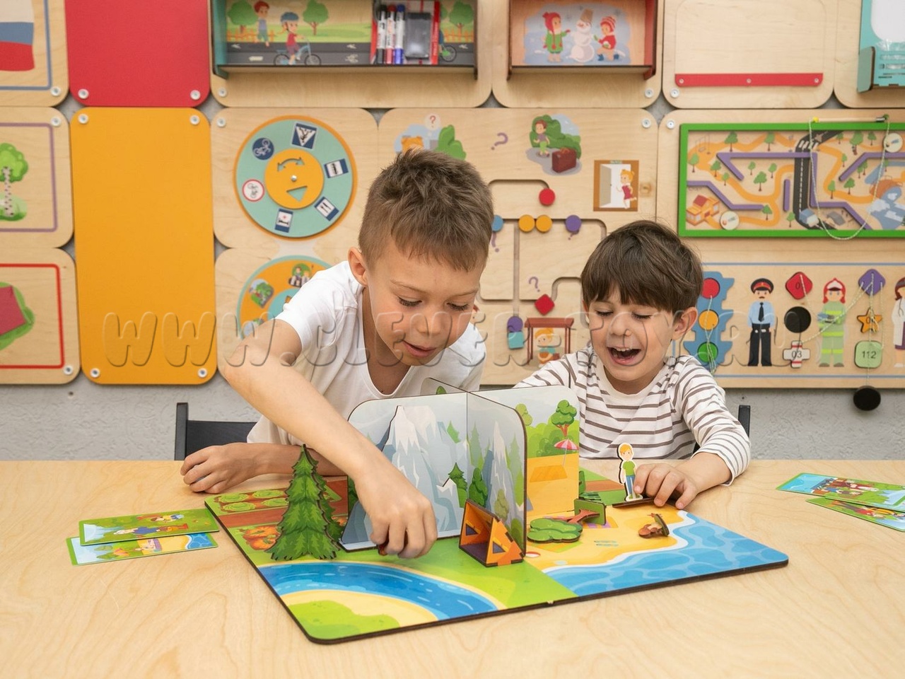 - Путешествие. Локация предлагает площадки для разыгрывания сюжетов семейного досуга в формате путешествий по России (поездка в горы, на пляж/водоем, в лес, на дачу).