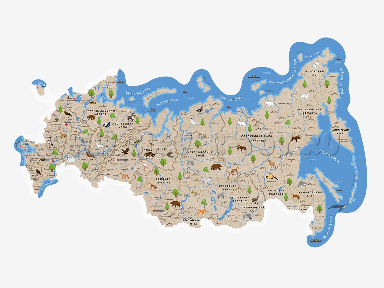 Настенная карта состоит из основы из прозрачного акрилового пластика, на который крепится карта из экологичной березовой фанеры. Сверху идет UF-печать стойкими к выцветанию красками, которая обеспечивает яркость и четкость изображений на протяжении длительного времени.