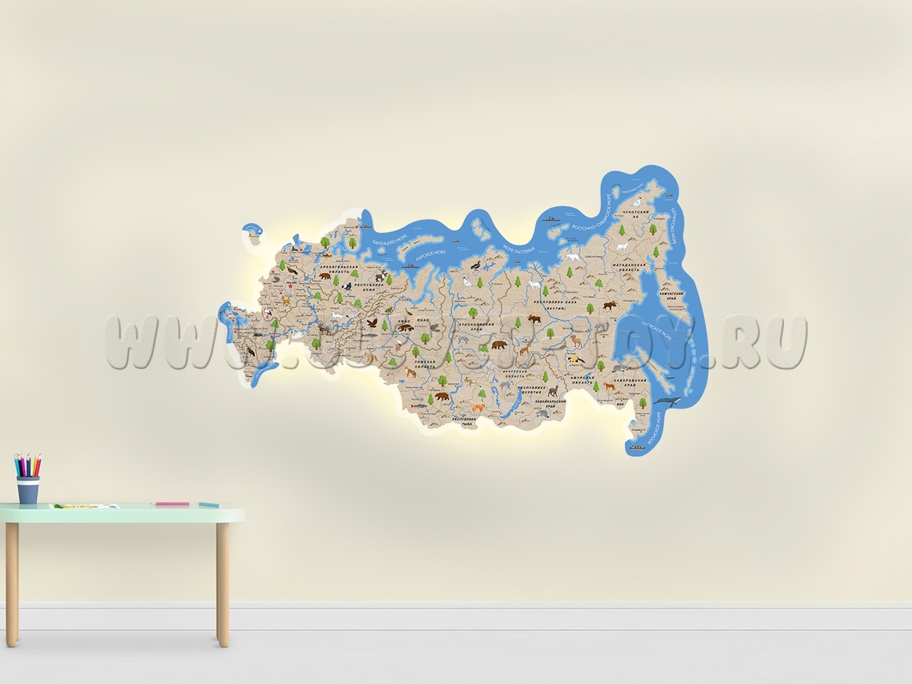 Особую эстетику карте придает подсветка и акриловые вставки, которые обозначают границу страны с другими государствами. Это позволяет карте быть не только образовательным, но и декоративным элементом.