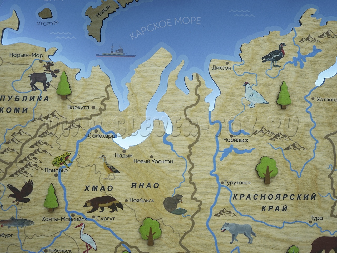 На карте указаны субъекты РФ: области, округа, края и республики с их столицами. Рисунками отображены редкие и охраняемые животные, птицы и рыбы, которые обитают в разных регионах России. Тактильными элементами карты являются деревья, а также звезды, центр которых подсвечивается с помощью маленьких светодиодов. Звездами отмечены города-герои - звания, которые присвоены городам, прославившимся своей героической обороной во время Великой Отечественной войны 1941-1945 годов.