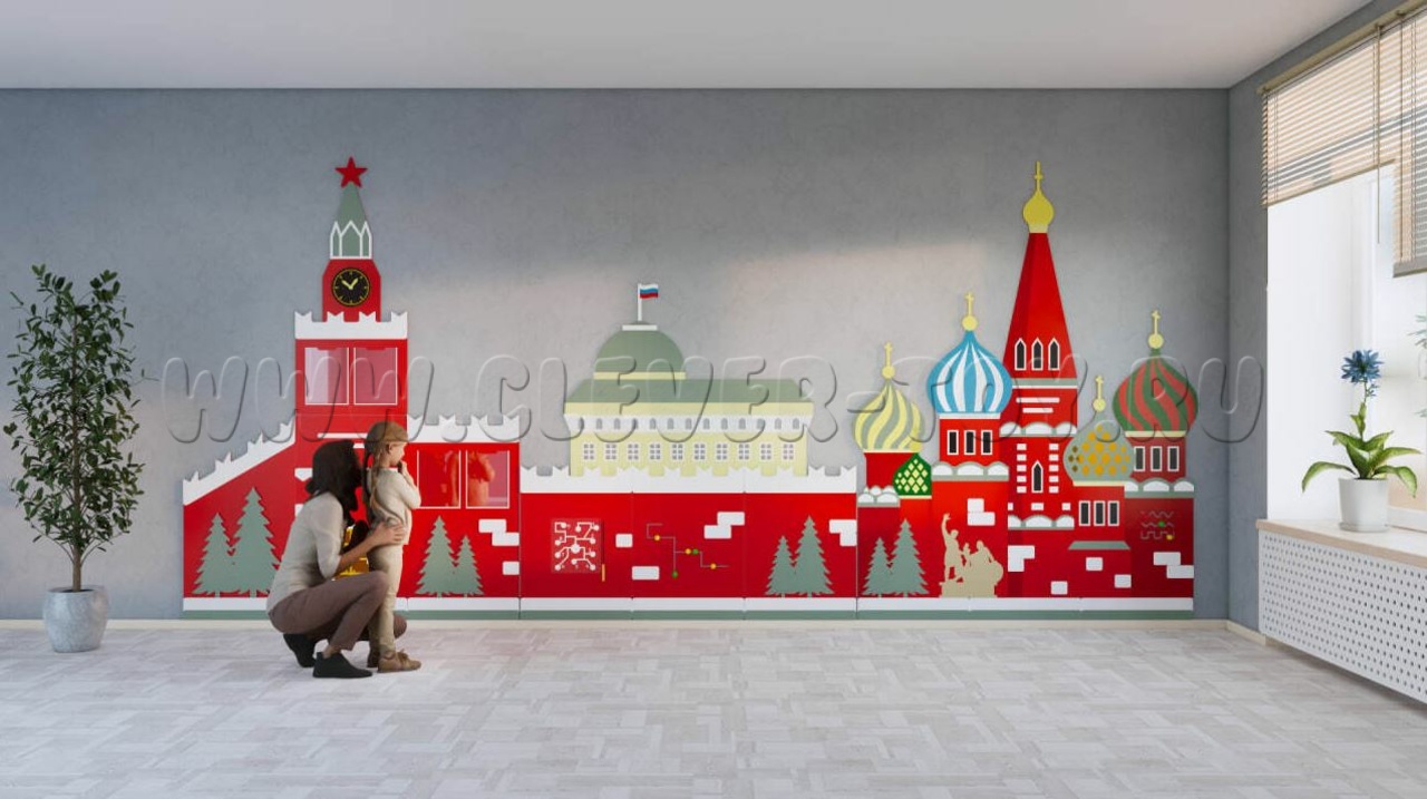 Декоративно-развивающая панель патриотического воспитания "Кремлевская площадь" - это отличное приобретение для больших холлов, рекреаций детских садов и школ.