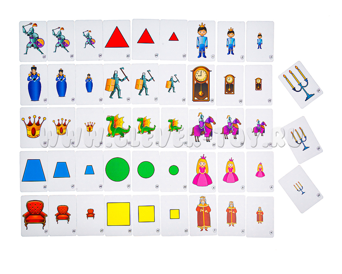 2. Игра «Замковый бой». Все карточки делятся между игроками. Каждый игрок складывает свои карты стопкой лицевой стороной вверх. Игроки одновременно выкладывают верхнюю карту своей стопки. Игрок, выложивший карточку с самым большим изображением, забирает себе все карты…