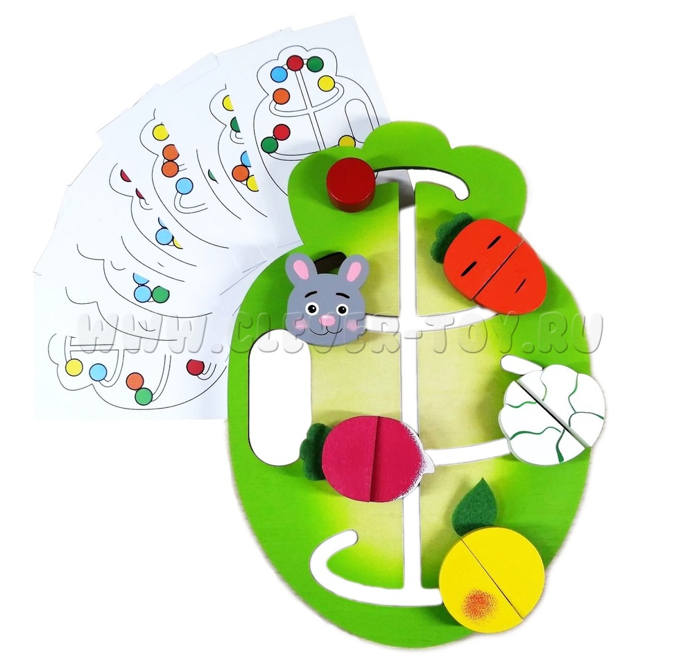 Игра «Накорми зайку» представляет собой лабиринт, состоящий из деревянного поля и фишек (капуста, морковка, яблоко, редиска) разделённые пополам, которые движутся по пазам.