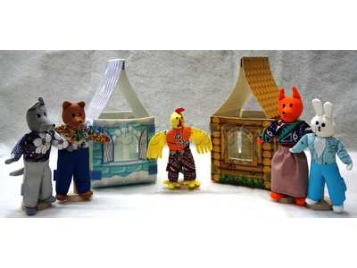 Перед вами - передвижной театр “Заюшкина избушка”, включающий следующих персонажей: заяц, медведь, петух, волк, лиса, а также 2 разборных мягких домика из фетра (ледяной и лубяной), которые вы сможете использовать не только в игре, а также для хранения и переноски персонажей.