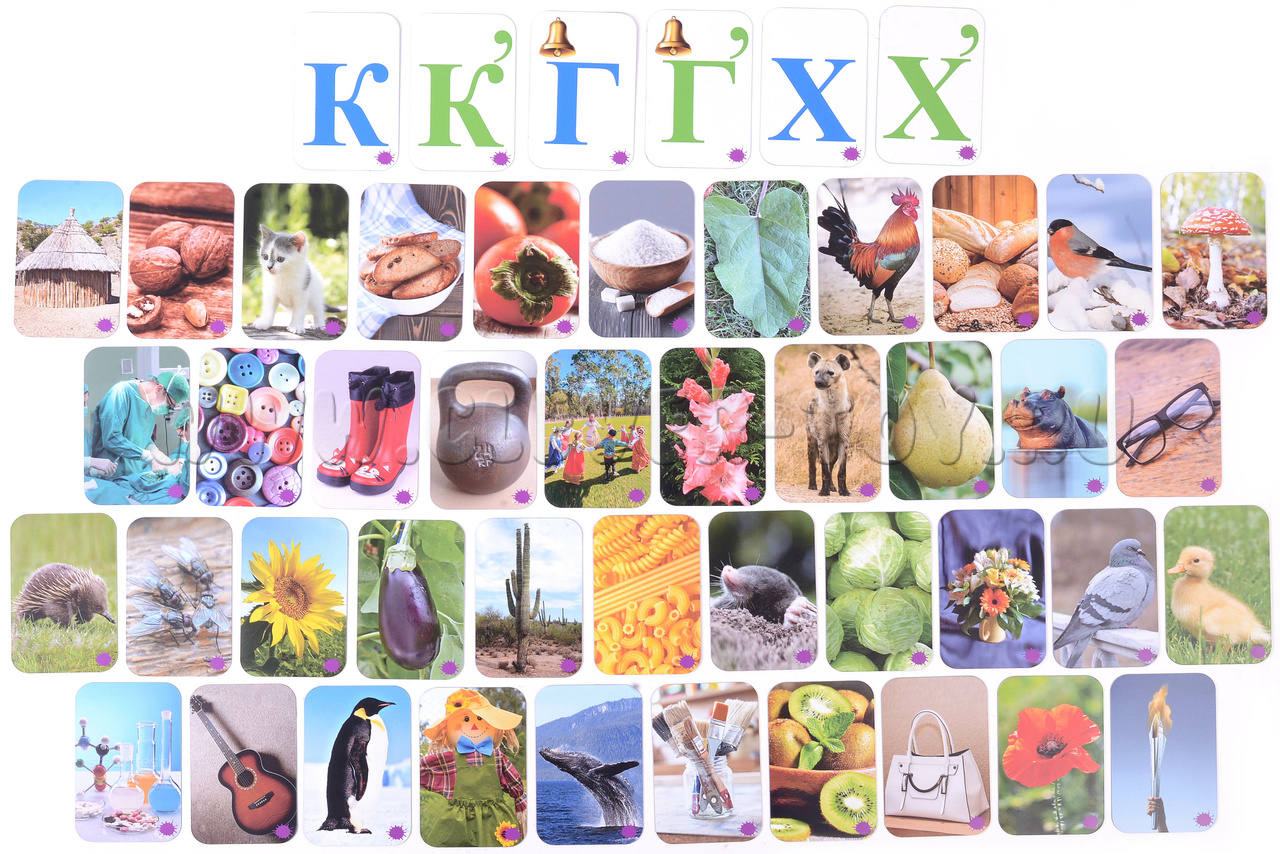 К, Г, Х, К’, Г’, Крот, Капуста, КаКтус, сумКа, баКлажан, маКароны, утёноК, КотёноК, маК; Голубь, Гладиолус, Груша, пуГовицы, пуГало, пинГвин; Хоровод, Хлеб, Хурма, муХомор, саХар, суХари, лопуХ, подсолнуХ, петуХ; Кит, Кисти, Кирпич, очКи, буКет, фаКел; Гитара, Гиря, Гиена, беГемот, сапоГи, снеГирь; Хижина, Химия, ХирурГ, еХидна, муХи, ореХи.