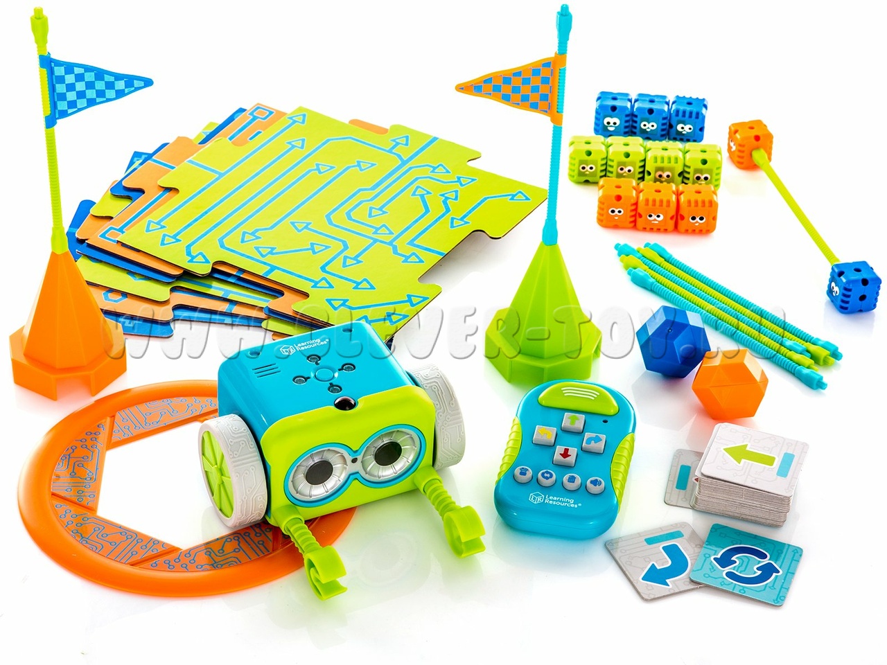 • различные аксессуары для создания препятствий на пути робота: 8 палочек, 12 кубов, 2 конуса, 2 флажка, 2 мяча и ворота;