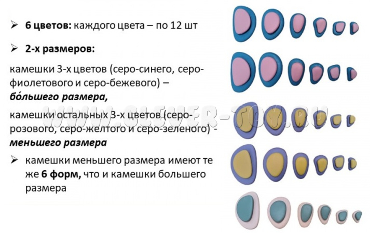 • 72 камешка 6 форм в 2 размерах, 6 цветов,